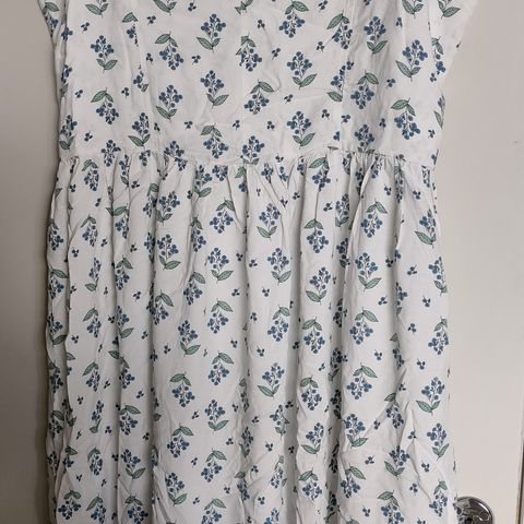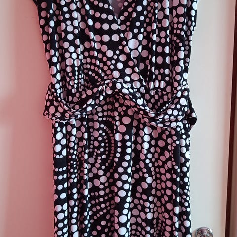 Materiaali 60% viskoosi, 36% polyester, 4% elastaani. Koko 5XL, kai-kai 67, olka-helma 135 cm. Hyvin laskeutuva, miellyttävä päällä. Pesty, siisti. Helmaosa ns tulppaani malli. Sivusaumoissa hyvänkokoiset taskut.