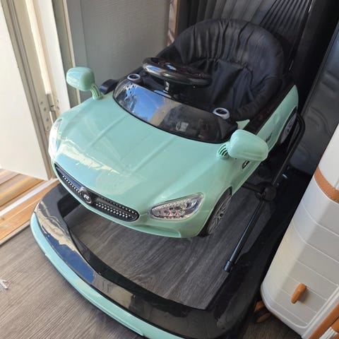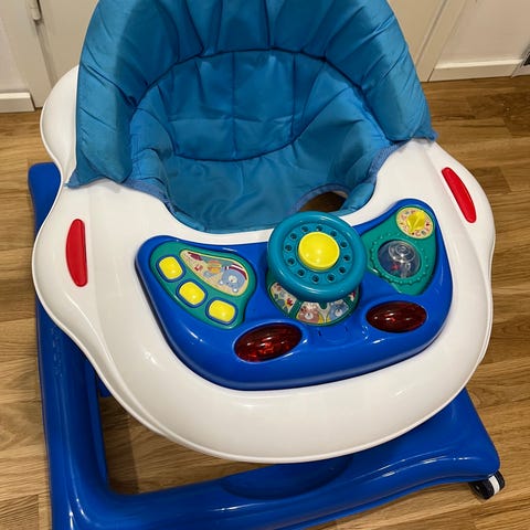 Myydään kävelytuoli, missä on värikäs istuinpäällinen pöllökuosilla sekä leluilla varustettu esipaneeli, jossa on muunmuuassa musiikkisoitin.