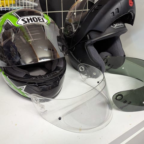 Shoein kerran käytetty moottoripyörä kypärä kokoa L. Kypärässä kirkas visiiri ja tumma visiiri. Edessä ja yläosassa ilmanottoaukkoja. Sisäpehmusteet ovat tummat. Mukana kuvissa näkyvät lisävarusteet. Soveltuu moottoripyöräilyyn ja muuhun kypärää vaativaan ajokäyttöön.