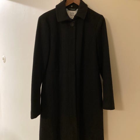 Harmaa pitkä villatakki, käytetty vain kaksi kertaa, aivan uusi. Koko L (eurooppalainen koko S-M), pituus 165/88 cm. 80 % puhdasta villaa, 20 % nailonia. Ei ollut tahroja tai virheitä. Alkuperäinen hinta 150 €.
