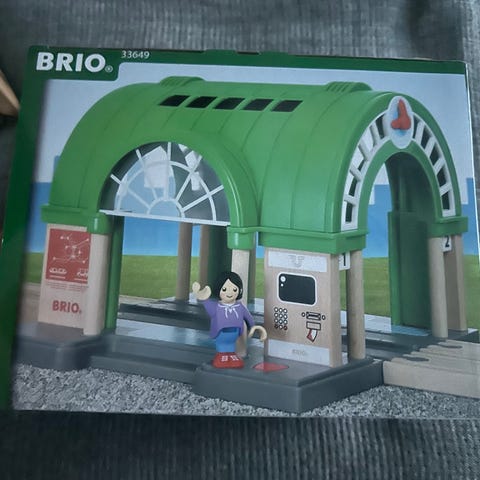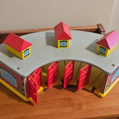 BRIO veturitalli ja kääntöpöytä puiseen lelujunaan. Veturitallissa on useita punaisia ovia ja se on yhteensopiva BRIOn puisten junaratojen kanssa. Kääntöpöydässä on puinen kiskopala, joka liittää tallin muuhun rataan.