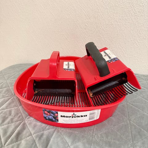 Punainen marjanpoimuri punainen muovi. Musta kädensija ja poimintapiikit.