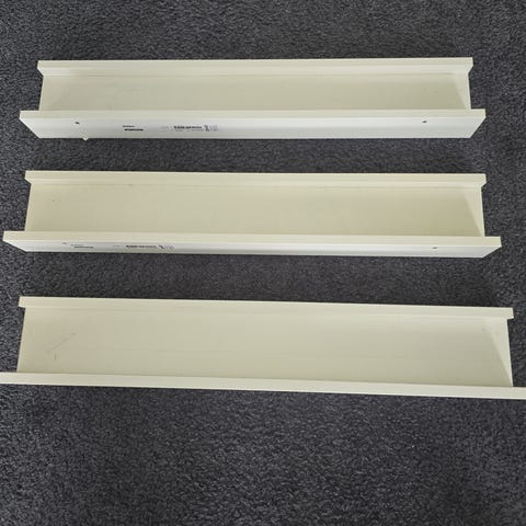 Ne pidemmät tauluhyllyt Ikeasta, kohatalaisessa kunnossa päistä, muuten siistit.