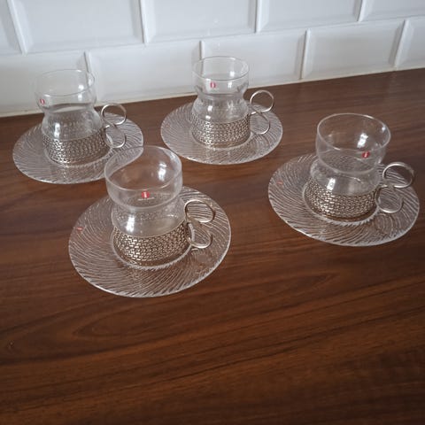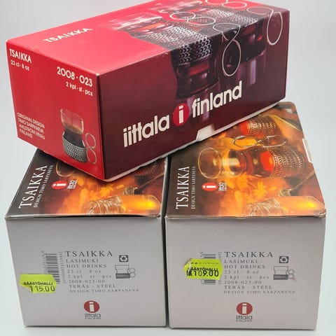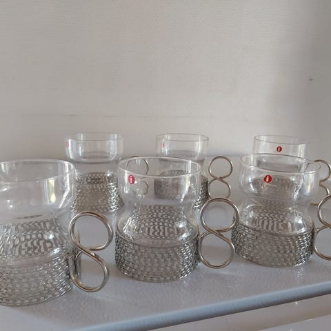 6kpl Iittala lasimukit metallipidikkeellä. Läpinäkyvät lasiosat ja irrotettavat metalliset pidikkeet, joissa koristeellinen verkkokuvio Iittalan Tsaikka-lasi on Timo Sarpanevan suunnittelema klassikko, jossa kohtaavat kaarevasti muotoiltu lasi sekä helposti tunnistettava, teräksinen pidike.