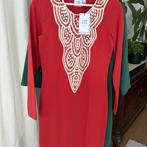 Myydään Lumoan 100 % luomupuuvillaa oleva pitsimekko kokoa XS, mutta menee myös S kokoiselle. Mekon pituus kauluksen reunasta helmaan 87cm, keveys kainaloiden alta 42cm, helman leveys 55cm.