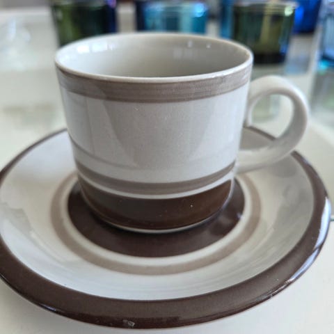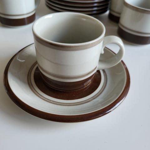 Arabia Pirtti kahvikuppi. Hyvä kunto. Kupin korkeus 6 cm, halkaisija 6,5 cm + lautanen