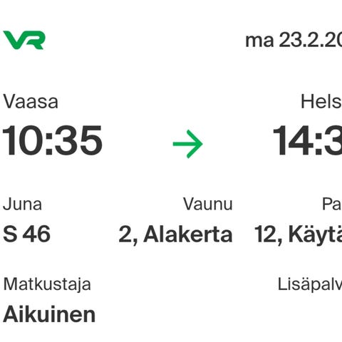 Myydään lasten junalippu Parkano-Helsinki. Lähtö klo ma 23.2 klo 12.05. Hintapyyntö vr:llä nyt 31.90€.