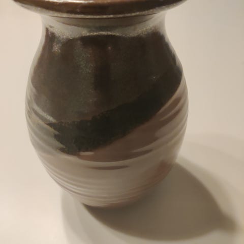 Kustavin saven maljakko. Väri toosa-ruskea. Korkeus 12.5 cm, suun leveys 8 cm, pohjan leveys 8 cm ja keskeltä leveämmästa kohdasta 14 cm.