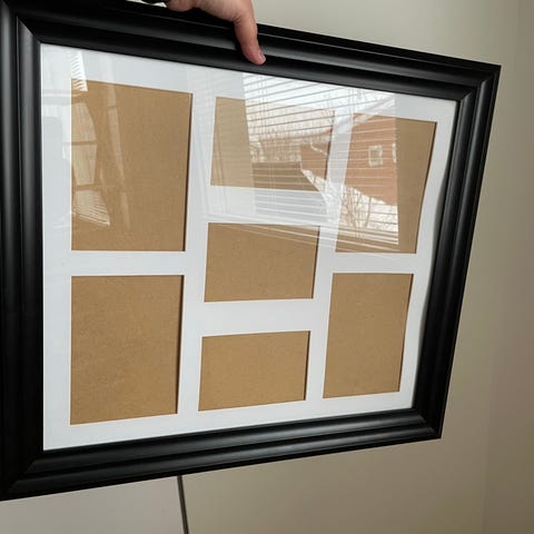 Valkoinen kehys johon saa 7 noin postikortin kokoista kuvaa.