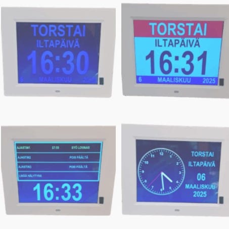 Seinään kiinnitettävä kalenterikello, joka sopii erityisesti dementikoille ja huonosti muistaville. Ollut pari vuotta käytössä, nyt jäänyt tarpeettomaksi.