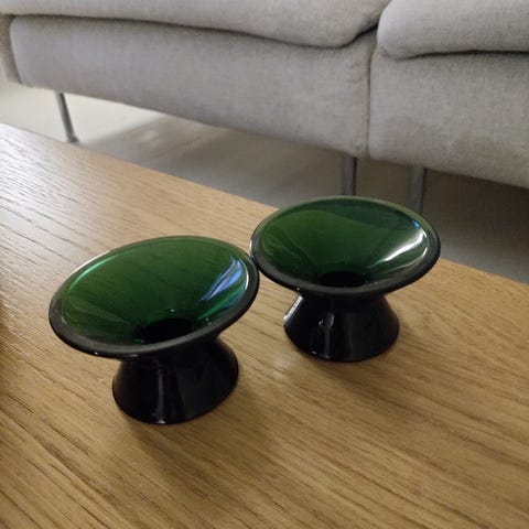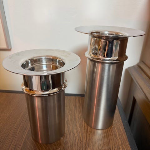 Iittala kynttilänjalat. Korkeat, kartionmalliset jalat ovat kirkasta lasia ja yläosat metallia. Sopivat kruunukynttilöille.