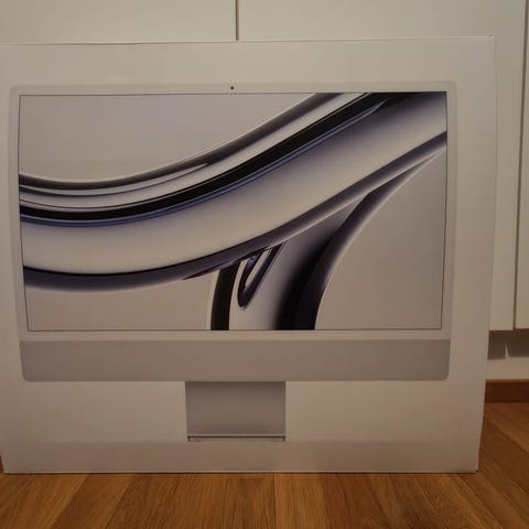 Apple iMac pöytätietokone. All-in-one-rakenteinen tietokone, jossa näyttö ja koneisto ovat samassa yksikössä. Väriltään hopea, alumiinirunko ja integroitu jalusta. Sopii yleiskäyttöön, kuten internetin selailuun, toimisto-ohjelmiin ja median katseluun.