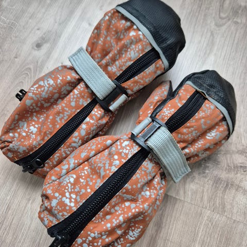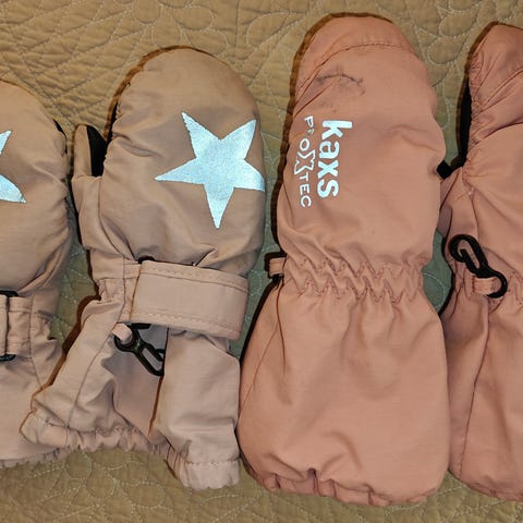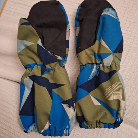 Uutena ostetut ja vähälle käytölle jääneet villaiset topparukkaset. Heijastavaa kangasta. Kokomerkintä nro 2 eli sopii 2-3 vuotiaille. Tarrat pitää loistavasti eikä näitä ole pesty muistaakseni kertaakaan, eli vedensietokyky on kunnossa.