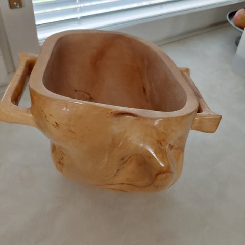 Jäätävän siisti iso pahkasta veistetty kulho, jossa "liekehtivät" puiset kuviot. Taidokkaasti käsityönä valmistettu, uniikki. Isohkon kokoinen, normaalisti pahkakulhot ovat paljon pienempiä. Näitä ei kaupasta löydy!