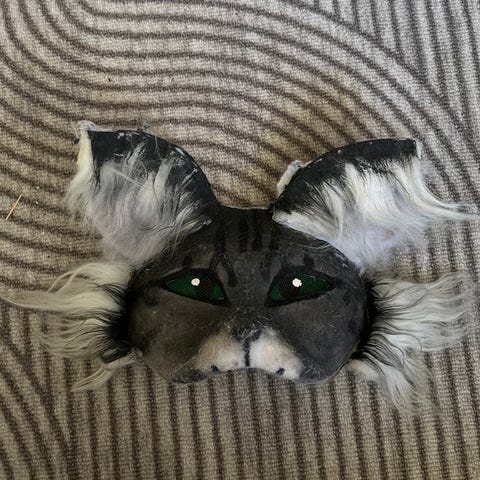 Maski on tehty kissamaski pohjasta ja siihen on lisätty korvat foamilla.