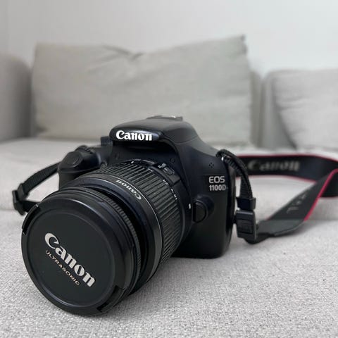 Canon EOS 1300D digitaalinen järjestelmäkamera. Musta runko irrotettavalla objektiivilla ja Canon-hihnalla. Mukana kantolaukku sekä laturi. Ollut vähällä käytöllä eli oikein hyvässä kunnossa.