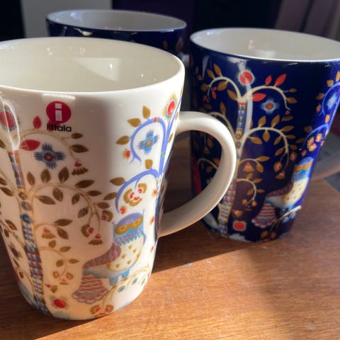 Valkoisissa mukeissa ei ole Iittala tarraa. Sinisissä yhdessä puuttuu tarra.
