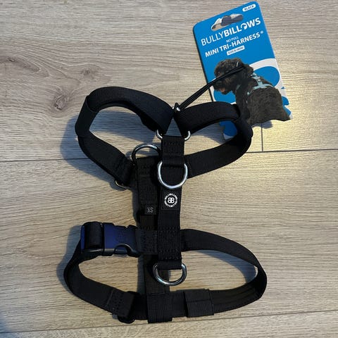 BullyBillows No Pull Tri-Harness koiran valjaat, koko C. Valjaiden väri on musta. Koko C sopii kaulanympärykselle noin 65–95 cm ja rinnanympärykselle noin 70–108 cm (valmistajan kokotaulukon mukaan). Malli on suunniteltu vähentämään koiran vetämistä lenkillä. Valjaissa on useita säätömahdollisuuksia ja metalliset D-renkaat taluttimen kiinnitystä varten. Soveltuu keskikokoisille ja suurille koirille, kun mitat tarkistetaan koirasta ennen käyttöä.