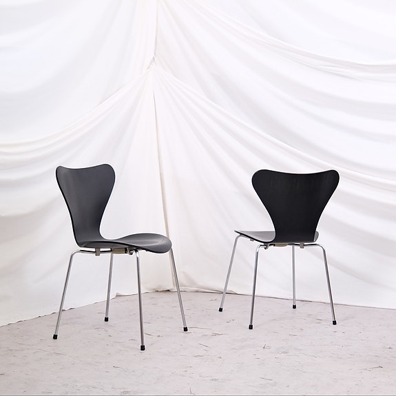Myynnissä Artek 65 -tuolit mustalla linoleum-istuimella.