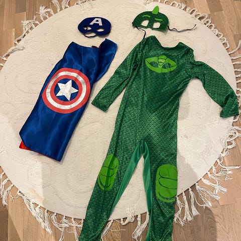 Lasten haalarit ja naamiaisasu, koko 116. Kaksi kokopitkää haalaria hupulla ja Ninjago-hahmokuvioilla sekä yksi pitkähihaisen kokoinen Spiderman-naamiaisasu. Sopivat noin 116 cm pituiselle lapselle esimerkiksi leikkiin, kotiasuksi tai naamiaisasuksi.