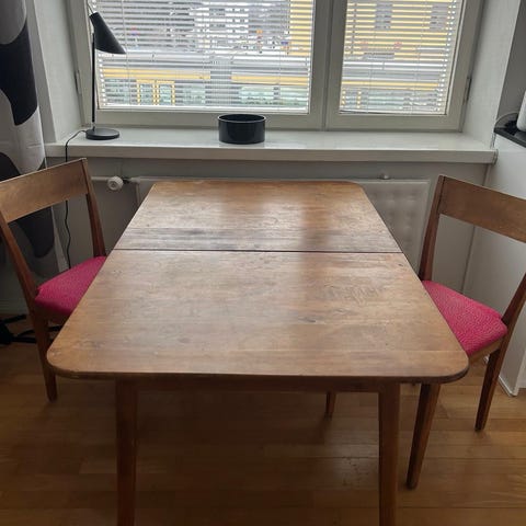 Myydään jatkettava vanttera ruokapöytä ja 4 tuolia. 1950-luvun tyyliä.
