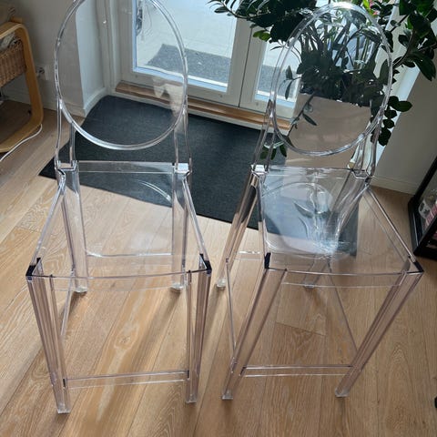 Kartell Louis Ghost -tuoli, suunnittelija Philippe Starck. Tuoli on valmistettu läpinäkyvästä polykarbonaatista ja siinä on käsinojat sekä pyöreä selkänoja. Sopii käytettäväksi ruokapöydän tuolina, työtuolina tai lisäistuimena olohuoneessa.