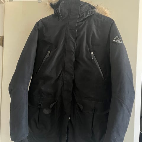 Icepeak naisten talvitakki, koko 38. Väriltään musta ja materiaalina polyesteri. Takissa on toppaus ja hupussa tekokarvareunus. Edessä vetoketju ja painonappikiinnitys sekä vetoketjulliset taskut. Hihassa on erillinen vetoketjutasku ja Icepeak-logo. Yhdessä hihassa on näkyvä repeämä, joka on huomioitava kuntoa arvioitaessa.