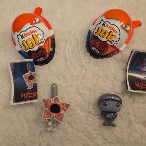 Myynnissä ylimääräisiä Stranger Things Kinder Joy hahmoja.