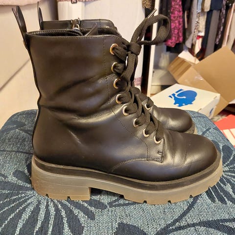 Mukana vaalean punainen säilytyspussi ja alkuperäinen laatikko. Kenkiä on vain sovitettu. Toisen kengän kärjessä ilmeisesti jo toimituksessa tullut pienehkö painauma. Laskin hintaa sen vuoksi.