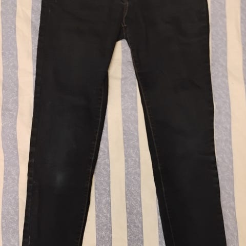 Kivat siniset farkut. Lapussa koko 36, mutta vastaa paremmin kokoa 38, koska normaalisti en mahdu kokoon 36. Edessä monta nappia, kaikki siis oikeita, ei vetoketjua.