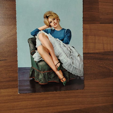 Vintage keräily postikortti 1962 Brigitte Bardot, jossa värivalokuva portailla istuvasta naisesta. Kortissa on sahalaitareunat . Sopii esimerkiksi keräilyyn tai sisustuskäyttöön, kuten kehystettäväksi tauluksi.Ikäisekseen muuten hyvässä kunnossa mutta takapuolella liimattua paperia.