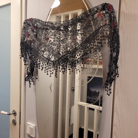 Luonnonvalkoinen ihana pitsi kolmiohuivi leveys 140 cm, korkein kohta 35 cm + hapsut. Kuvista ei näy mutta hieman hopeaglitteriä kukissa. Voi käyttää vaikka tukassa esim pantana tai nutturassa. Pk kuuluu hintaan (yhdellä postimerkillä kirjeessä).