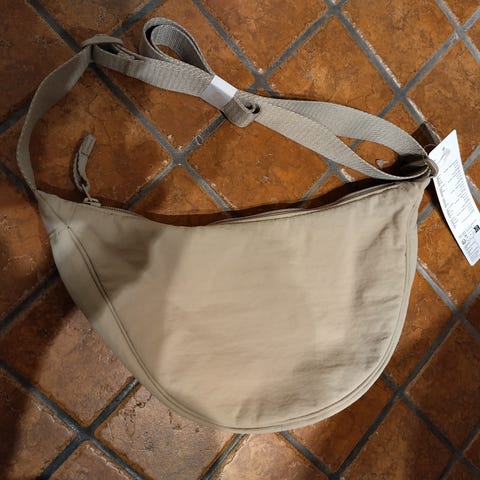 Uniqlon kaupasta Pariisista 11/25 ostettu uusi minikokoinen pikkulaukku. Hieman topatun oloinen. Kasarituulipukukangasta. Tähän mahtuu puhelin ja joitakin pikkutavaroita. Toisella sisäsivulla kaksi pukkutaskua. Laukun mittoja noin: