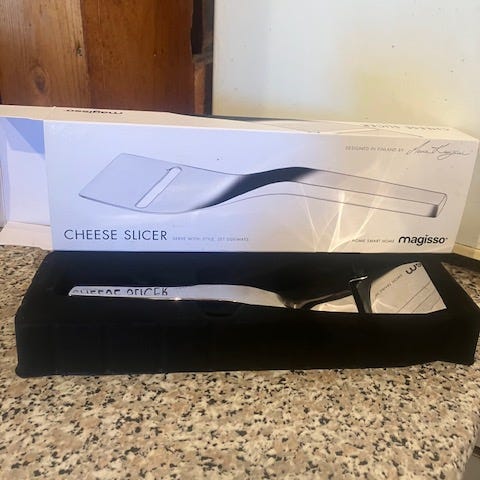 Uusi käyttämätön Magisso juustoveitsi lahjapakkauksessa.