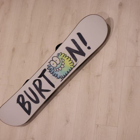 Pari talvea laskettu hyväkuntoinen lumilauta Grom-siteillä. Pohja kaipaa kerroksen luistovoidetta.