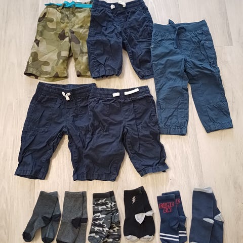 Poikien vaatepaketti, koko 92, kirjava. Paketissa useita erilaisia vaatteita, kuten housuja, uimashortsit, pitkähihainen kauluspaita sekä pipo, kahdet kalsarit, näiden koko 90cm. Ylhäältä alaspäin ->