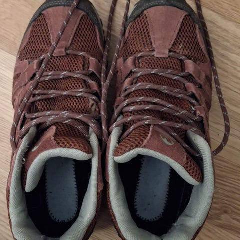 Merrelin vedenpitävät kengät. Kokomerkintä 37, mutta sanoisin, että enneminkin 38, ovat aika runsasta kokoa. Hyvässä kunnoss ja kauniin väriset.