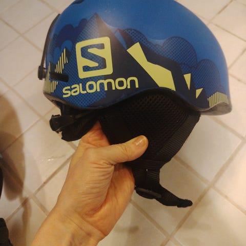 Salomon laskettelukypärä lapselle/aikuiselle, koko M 53-56 cm. Kypärä on väriltään musta, jossa siniset tehosteraidat ja Salomon-logo sivulla. Mallissa on korvalliset pehmusteet, säädettävä leukahihna pikalukolla sekä takana säätömekanismi istuvuuden hienosäätöön. Kypärässä on useita ilmanvaihtoaukkoja ja takana pidike laskettelulasien kiinnitystä varten. Soveltuu lasketteluun ja lumilautailuun.