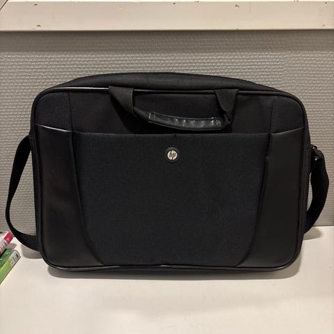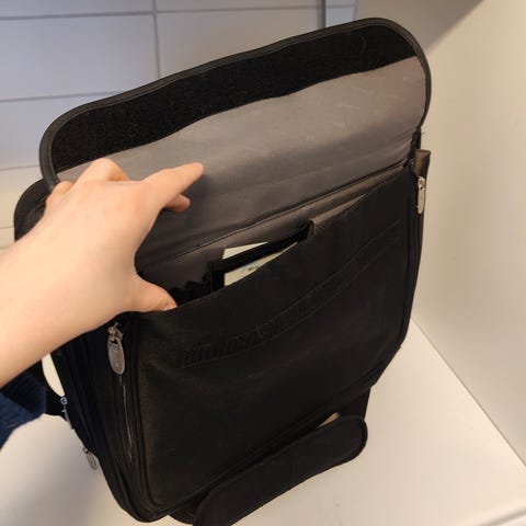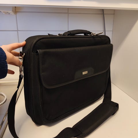 Siistissä kunnossa, kahva vähän kulunut. Kolme vetoketjullista isoa taskua (ks. kuvat) ja kaksi pienempää taskua sivuilla. Kannettu läppäriä, joka kooltaan 38 x 25,5 cm. Vain nouto.