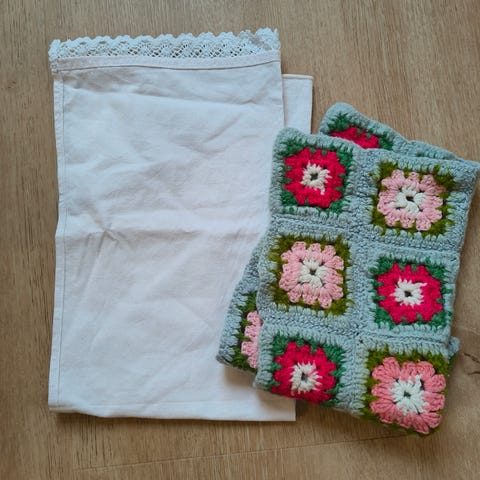 Marimekon kankaasta ommellut pussilakana ja tyynyliina. Lisäksi valkoinen lakana. Mukaan täkki ja pehmeä tyyny nukelle. Kaikki oikein siistissä kunnossa. Savuton talous.