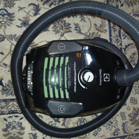 Electrolux EasyGo pölynimuri musta. Perinteinen pölypussillinen imuri, jossa tehosäätö ja erilliset painikkeet käynnistykselle ja johdon sisäänkelaukselle.