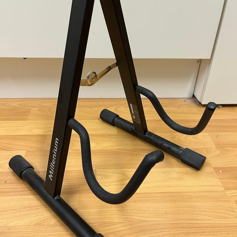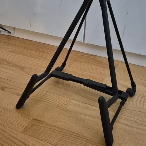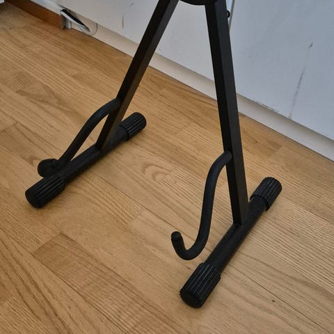 J&D kitarateline sähkökitaralle tai akustiselle kitaralle. Teline on musta ja valmistettu metallista, jossa on pehmustetut kosketuspinnat suojaamaan soitinta. Sopii lattialle asetettavaksi ja on kokoontaitettava säilytystä ja kuljetusta varten.