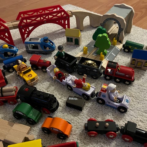 Puinen junarata-lelu, johon kuuluu puinen junarata kaarteineen ja silloilla, juna ja vaunu, rakennuksia, siltoja sekä erilaisia puuhahmoja ja eläinfiguureja. Sopii lasten leikkeihin ja mielikuvitusleikkeihin sisäkäyttöön. Veturi toimii pattereilla