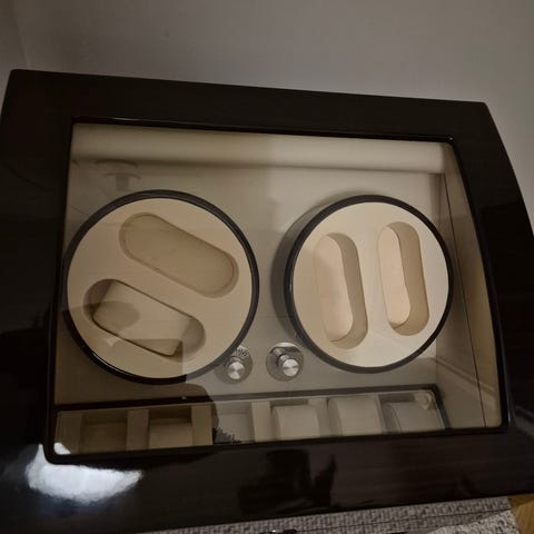 Automaattikellojen pyörittäjä. Neljä pyörittäjää, yhteensä 8 kellolle. Yhdessä pyörittäjässä käyntihäiriö. Lisäksi laatikko useamman kellon säilytykseen. Mitat k 49 l 38 s 22 vm, väri tumman ruskea. Pakila/Helsinki. Myydään tarpeettomana sopivasti 80 euroa.