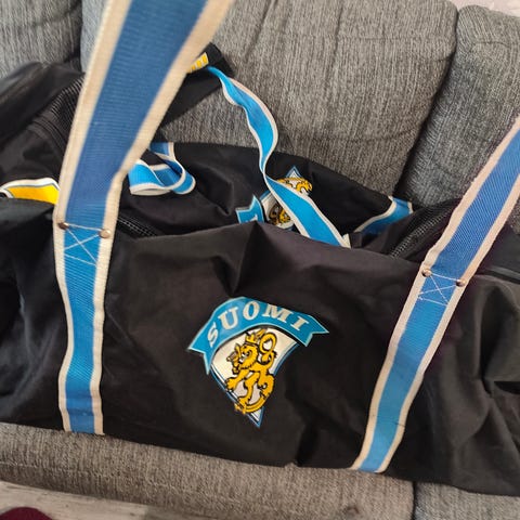 ISO warriorin vedettävä varustekassi, tänne mahtunut hyvin jr kokoiset maalivahdin varusteet. Pyörät kulkee hyvin ja vetoketju toimii. Kankaassa pari tosi pientä reikää.