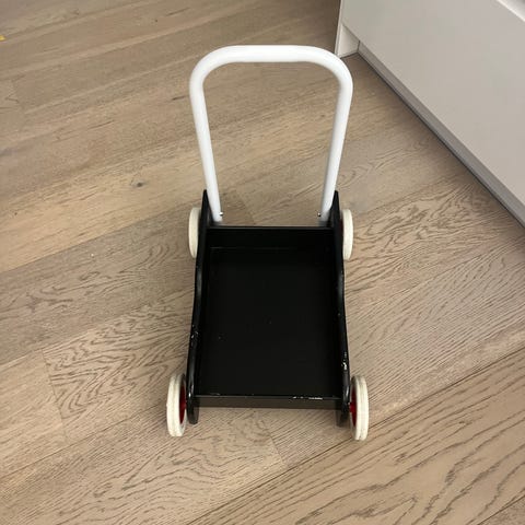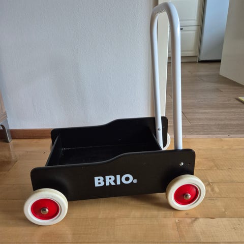 BRIO kävelyvaunu lapsille. Musta vaunu, jossa valkoiset pyörät punaisilla keskiosilla ja metallinen työntöaisa. Soveltuu pienten lasten kävelyn harjoitteluun ja lelujen kuljettamiseen sisätiloissa. Runko on puuta ja metallia, ja vaunussa on avoin säilytystila tavaroille.