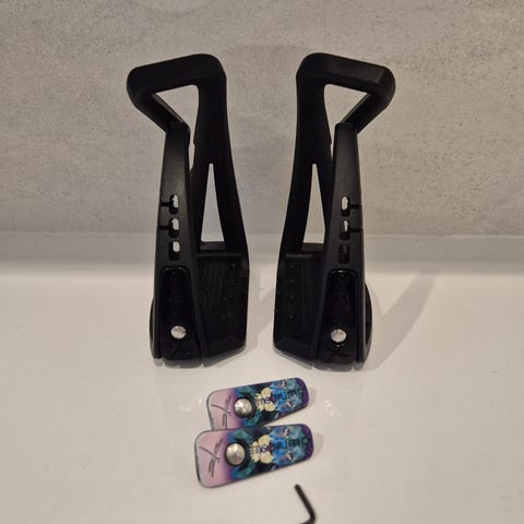 Hyvässä kunnossa olevat ruskeat Freejumpin turvajalustimet. Sopivat kaikille, ei rajoitusta kengän kokoon. Erityisen leveä ja pitävä jalansija. Kaikki 8 nastaa hyvässä kunnossa.