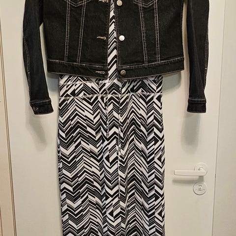 Uusi musta- valkoinen maximekko, sopii juhliin. Täyspitkä hihaton alushame jossa säädettävät olkaimet. Edessä avattava napitus vyötärölle asti Ohutta kangasta jonka pinta hohtaa kauniisti. Koko 50/52. Kaikai 68 cm, kokopituus 133 cm, helman leveys ennen rypytysosaa 108*2 cm. Polyesteriä. 40€+pm