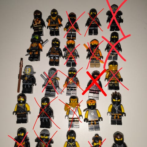 Etsimässä näitä figuureja ja osia, kuvissa lukee osien määrät.