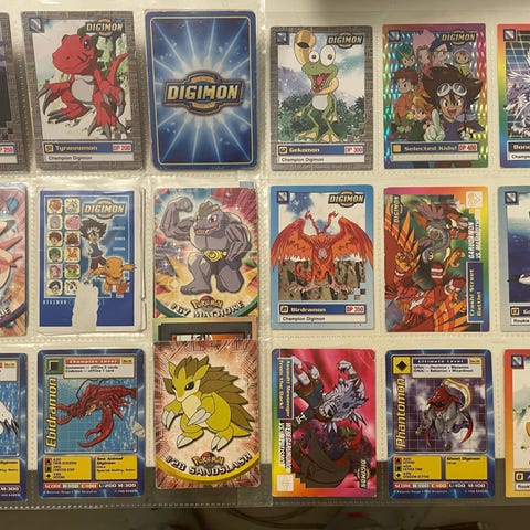Sekalainen setti kaapin pohjalta. Otsikossa mainittuja kortteja eri kunnoissa sekä joitakin tarroja ja muita keräilykortteja. Digimon aloituspakkaus sisältöineen. Luultavasti kaikki tallessa. Magic the Gathering Basri-pakassa alkuperäinen sisältö.